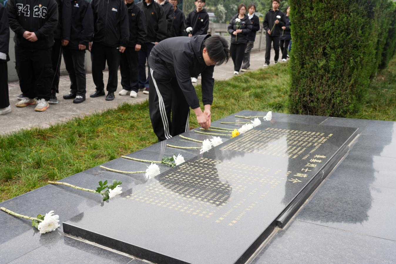 全体师生缓步绕行,瞻仰烈士纪念碑。在烈士墓区,师生们擦拭墓碑、敬读碑文,向烈士们献上鲜花并行鞠躬礼,深情缅怀革命先烈。