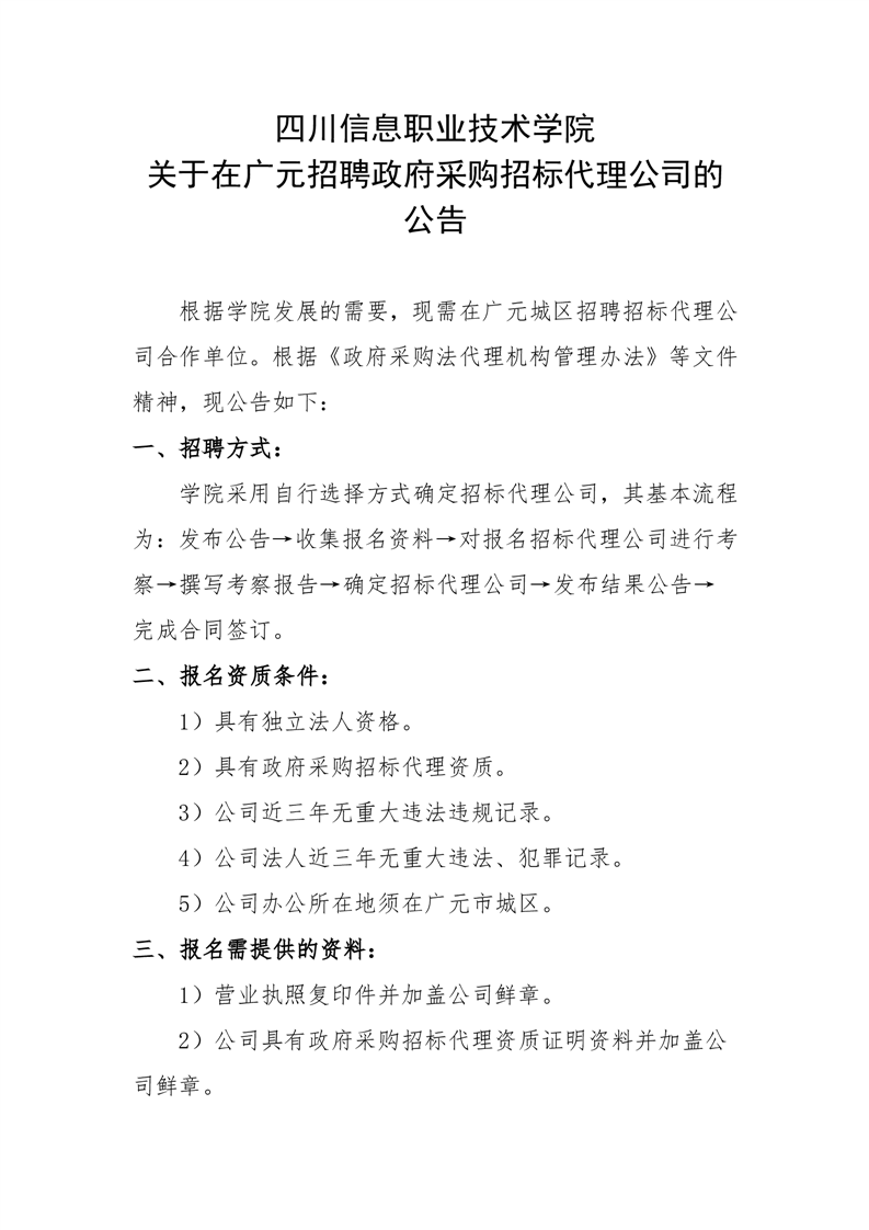 四川信息职业技术学院关于在广元招聘政府采购招标代理公司的公告