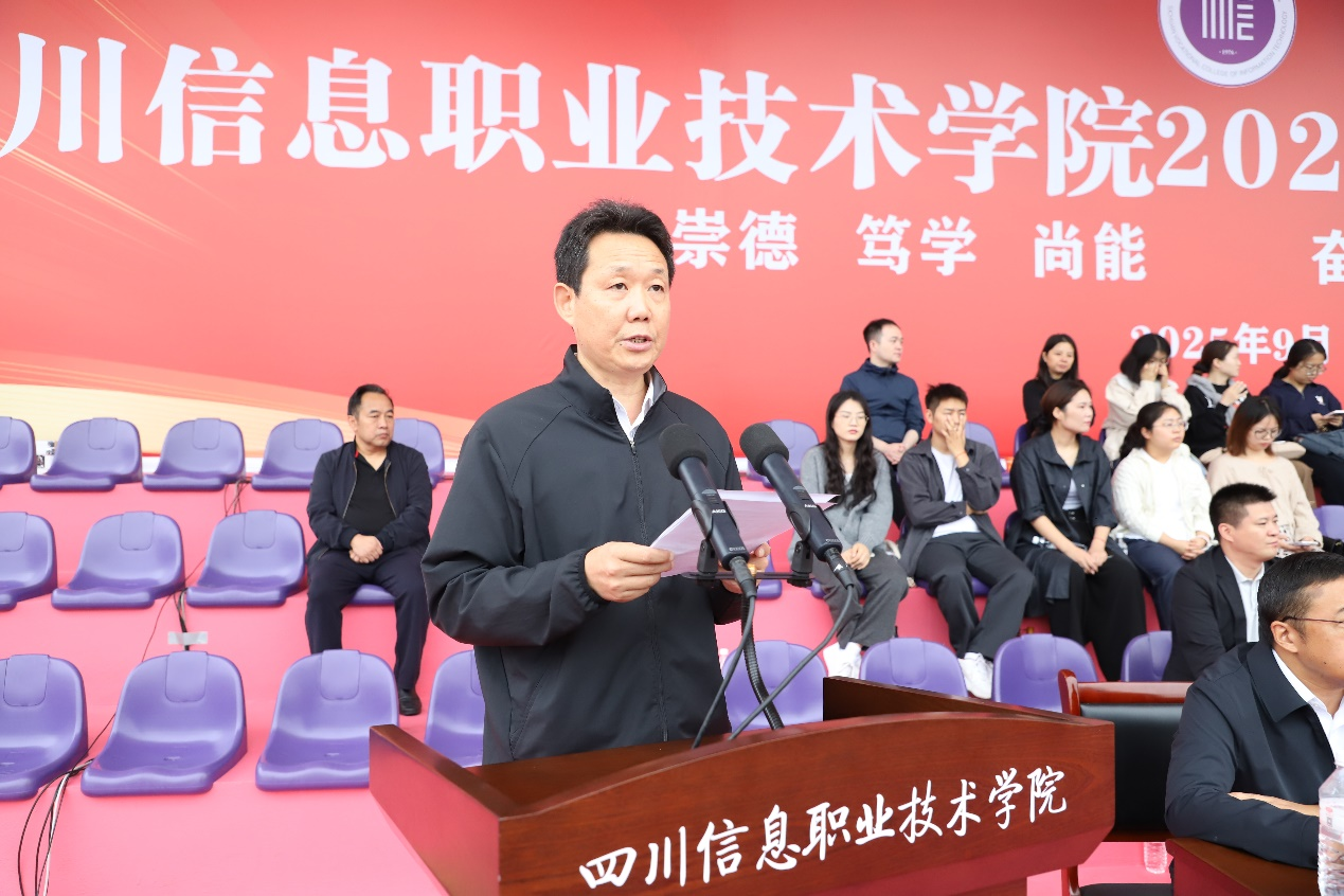 9月28日上午,学院2025级新生军训总结大会在雪峰校区田径场举行。学院党委副书记刘凯及在家院领导班子其他成员,广元市利州区人民武装部政委黄林,广元市教育局相关工作人员,学院职能处室、二级学院主要负责人、承训教官及2025级新生参加大会。会议由学院党委委员、副院长杨华明主持。