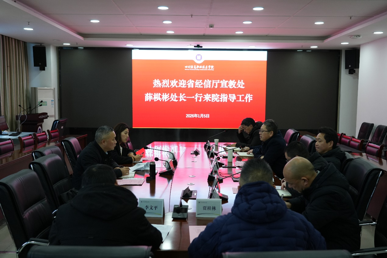 1月5日,省经济和信息化厅宣传教育处处长薛棋彬一行来院调研指导工作,学院党委副书记、院长韩鹏,党委副书记刘凯,党委委员、副院长吕强,党委委员、副院长杨华明及相关职能部门负责人陪同调研。