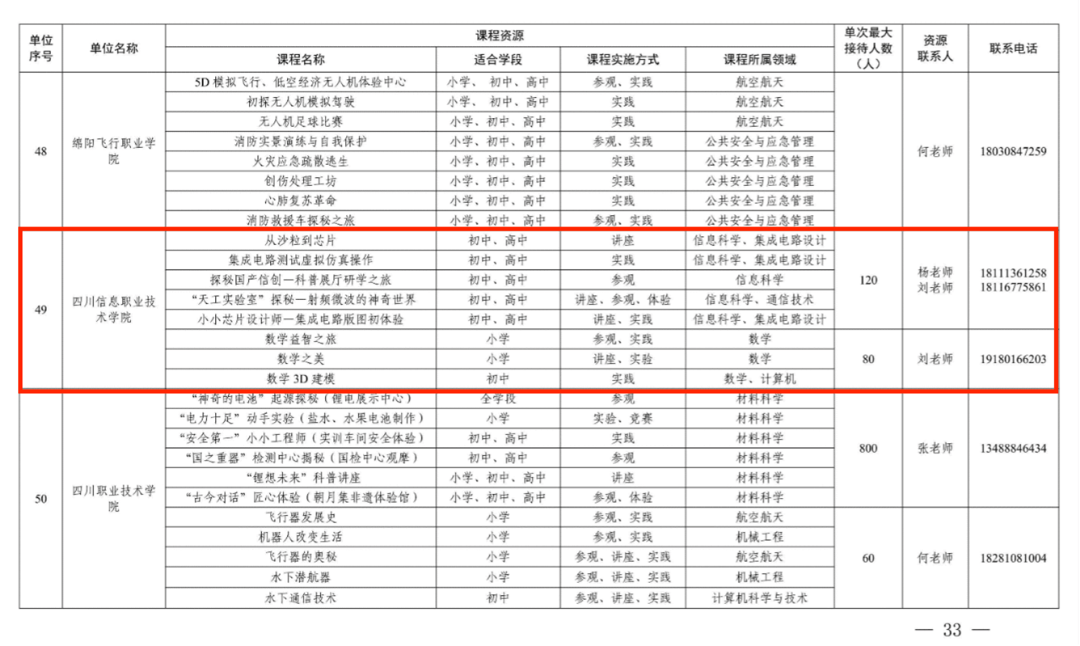3月20日,四川省教育厅发布了《关于公布中小学生科普教育类研学实践教育资源的通知》,学院申报的《从沙粒到芯片》《数学3D建模》等8项课程资源成功入选“四川省中小学生科普教育类研学实践教育资源”名单,标志着我院优质教学资源正式面向全省中小学生开放,服务基础教育科普工作迈上新台阶。