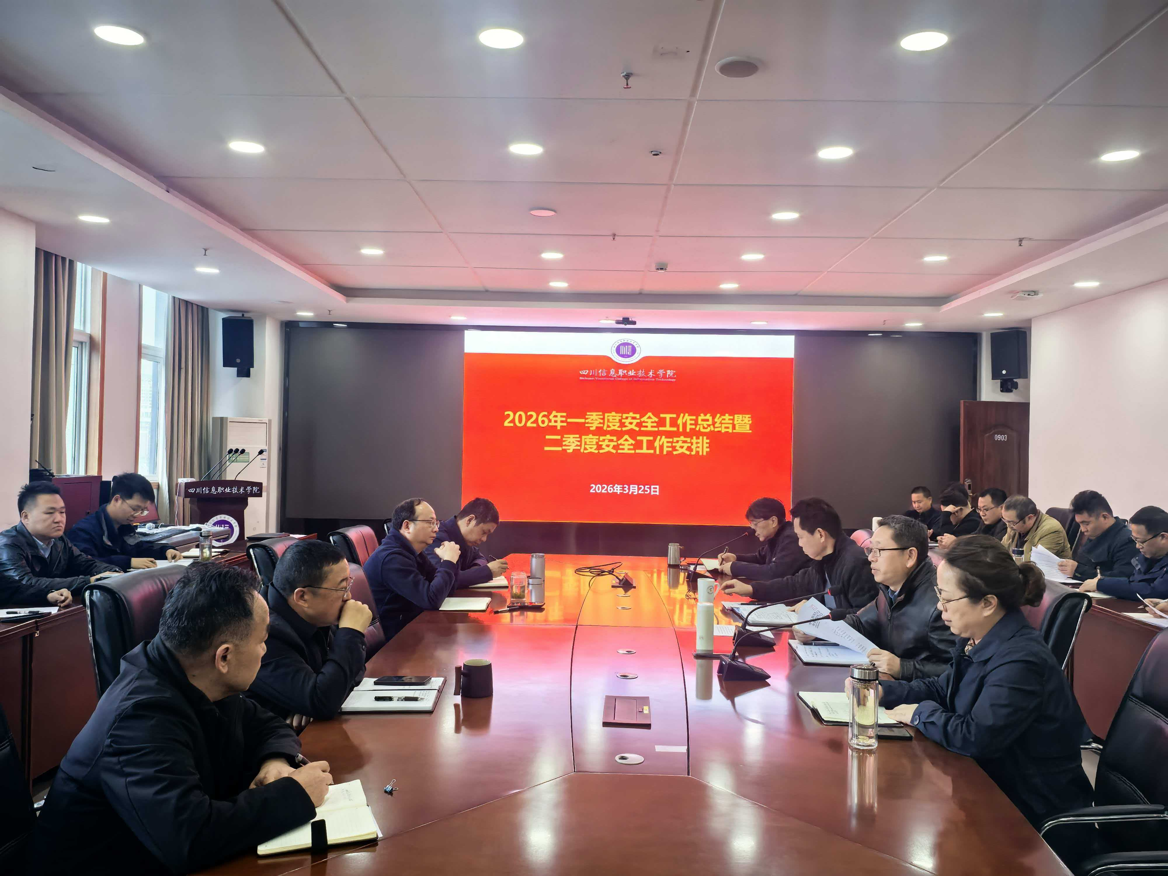 3月25日,学院2026年一季度安全工作总结暨二季度安全稳定工作会在综合楼0903会议室召开。在家院领导,全体中层干部及保卫干部参加会议。会议由党委副书记、院长韩鹏主持。
