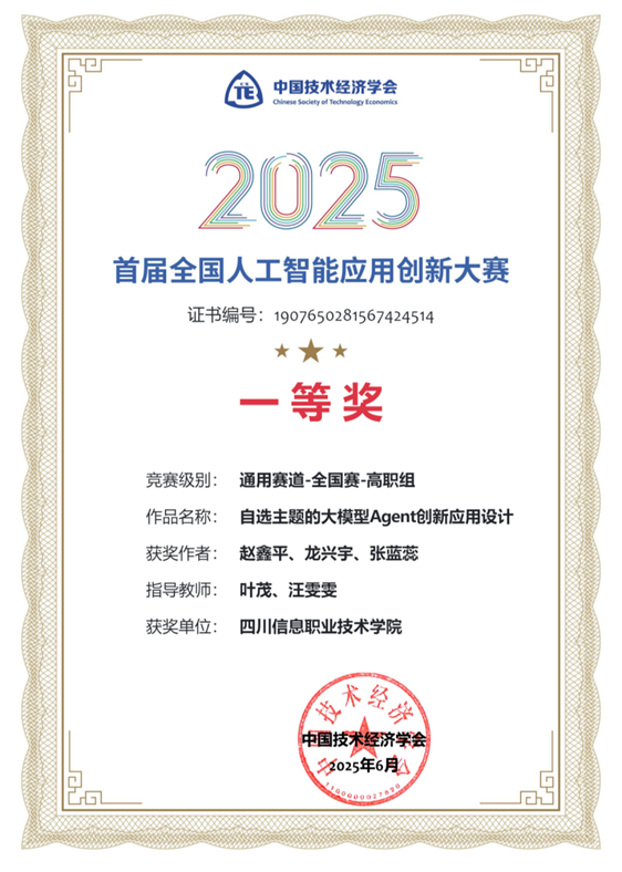 据悉,2025首届全国人工智能应用创新大赛是一项以经济学、管理学及其他领域课题作为应用场景,考察参赛选手设计AI智能体(AI Agent)、应用人工智能大模型技术解决相应问题的竞赛。比赛于4月至6月举行,全国近20000个学生及企业团队参加了比赛,高职组共有25个团队进入全国总决赛。