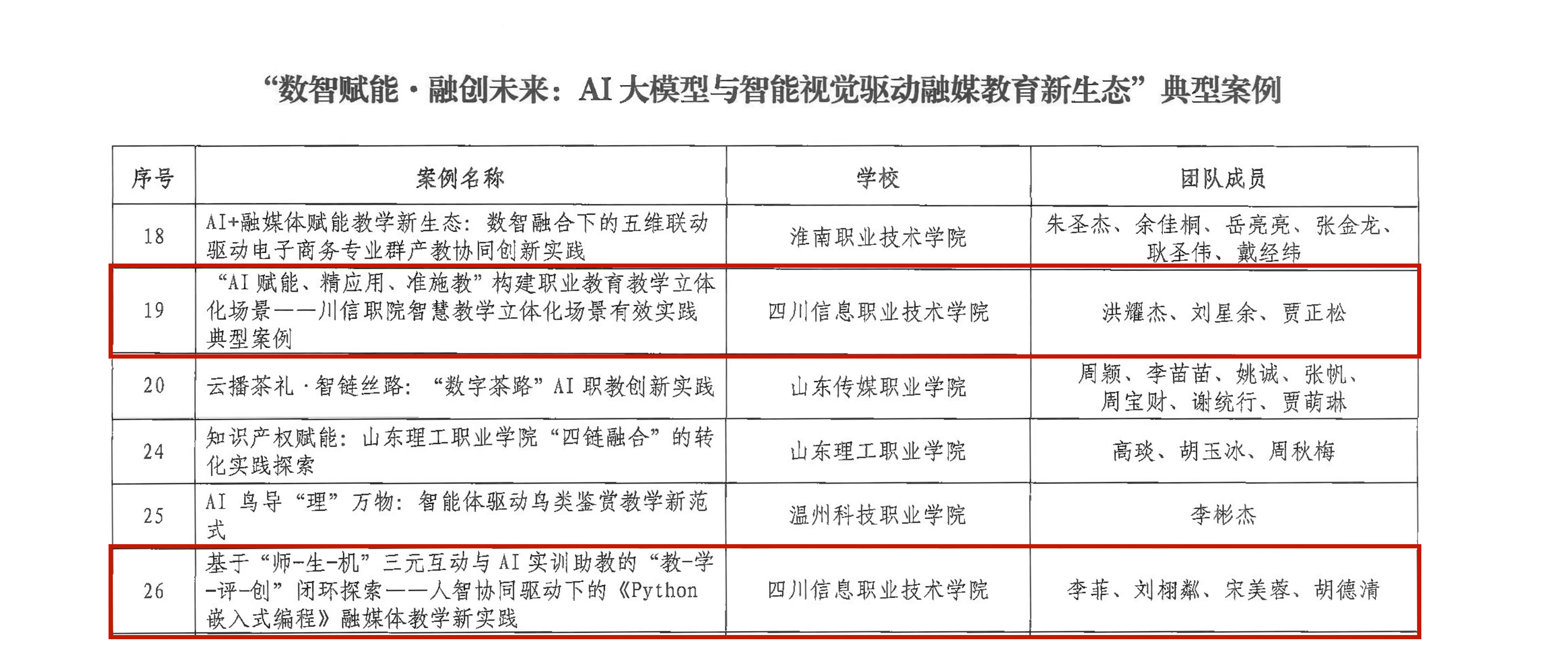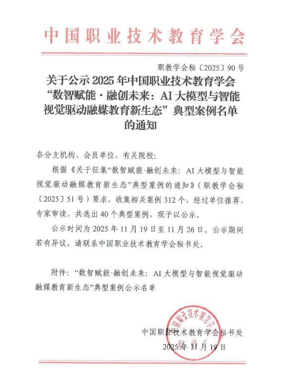 近日,中国职业技术教育学会公布了“数智赋能·融创未来:AI大模型与智能视觉驱动融媒教育新生态”典型案例名单。我院“‘AI赋能、精应用、准施教’构建职业教育教学立体化场景——川信职院智慧教学立体化场景有效实践典型案例”“基于‘师-生-机’三元互动与AI实训助教的‘教-学-评-创’闭环探索——人智协同驱动下《Python嵌入式编程》融媒体教学新实践”,在全国312个申报案例中脱颖而出,成功入选40个年度典型案例,成为职业教育数字化教学改革的标杆实践之一。