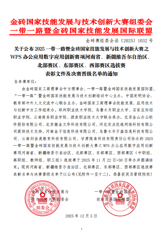 近日,在2025年一带一路暨金砖国家技能发展与技术创新大赛首届WPS办公应用数字应用创新赛西部赛区选拔赛中,我院教师李敏、张国丽、周豪荣获教师组一等奖,瞿艺、程浩荣获教师组二等奖,并晋级全国总决赛。