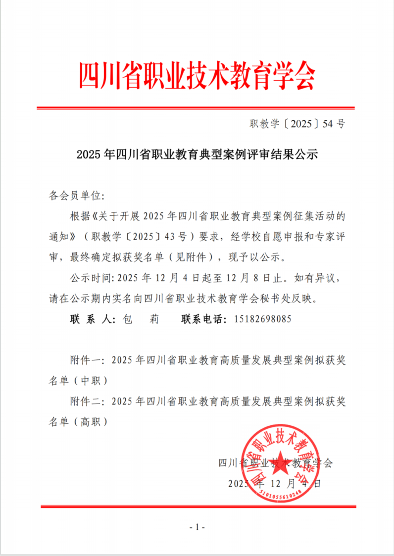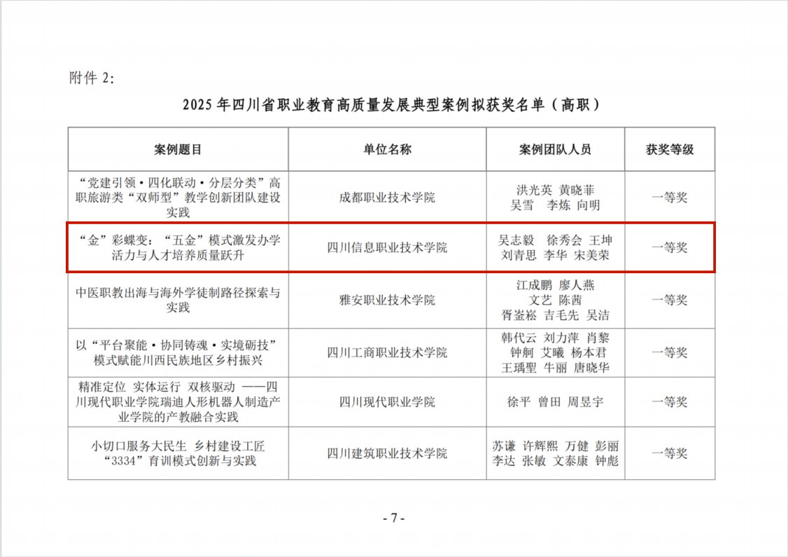 近日,四川省职业技术教育学会公示了2025年四川省职业教育高质量发展典型案例拟获奖名单(高职),我院教师团队撰写的案例《“金”彩蝶变:“五金”模式激发办学活力与人才培养质量跃升》荣获一等奖。