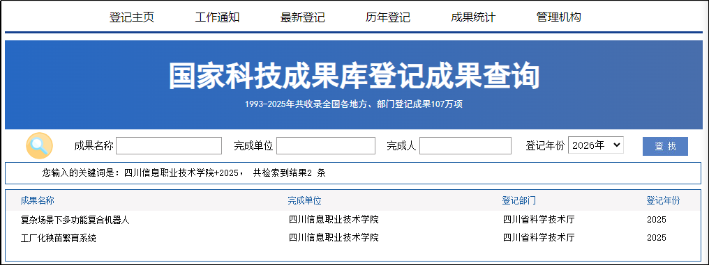 4月3日,《复杂场景下多功能复合机器人》《工厂化秧苗繁育系统》两项科技成果,经四川省科学技术信息研究所评价鉴定,四川省科学技术厅审核推荐,成功完成2025年度国家科技成果登记,正式入库国家科技成果库。这是学院持续深化科技创新、赋能“双高计划”建设取得的又一重要标志性成果。